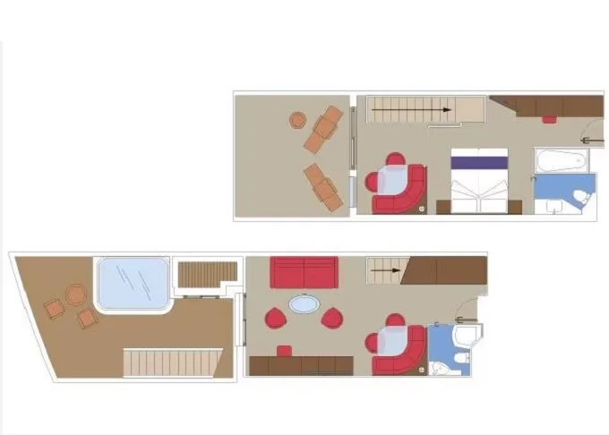 YCD - Yacht Club Duplex Suite 46 m² + balkón 6 m². 2 podlažia, 2 kúpeľne (1 s vaňou) Max 4 osoby. 16. paluba. Cenový model MSC Yacht Club. | 8 130 € 8 130 € za osobu | ||