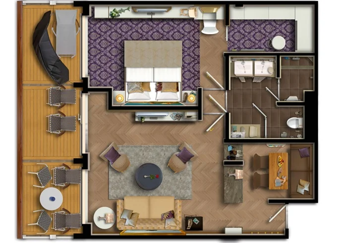 | SUTO - Themen Suite 54 m² + balkón 15 m² so stolom, ležadlom a hojdacou sieťou. Spálňa, obývacia časť, šatník. 10. paluba. Max 4 osoby. Výhody Suite. | 16 197 € 5 399 € za osobu |