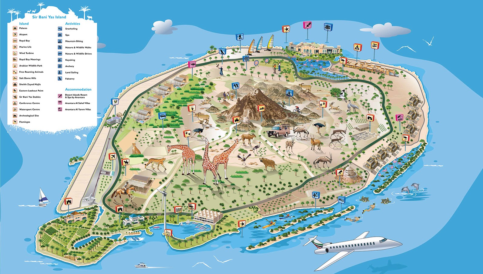 Vyše polovicu ostrova predstavuje Arabian Wildlife Park s voľne sa žijúcimi divými zvieratami, ktoré pochádzajú z Arabského poloostrova, vrátane ohrozených druhov ako arabský oryx, morská korytnačka, piesková gazela a horská gazela a niektorých dravcov ako sudánsky gepard a prúžkovaná hyena. Park môžete navštíviť v organizovaných peších exkurziách, na horských bicykloch alebo na 4x4 džípoch.